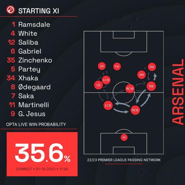 阿森纳阵容:拉姆斯代尔/本·怀特、萨利巴、加布里埃尔、津琴科(73’蒂尔尼)/托马斯(73’洛孔加)、扎卡/萨卡、厄德高(80’法比奥·维埃拉)、马丁内利/热苏斯(80’恩凯蒂亚)